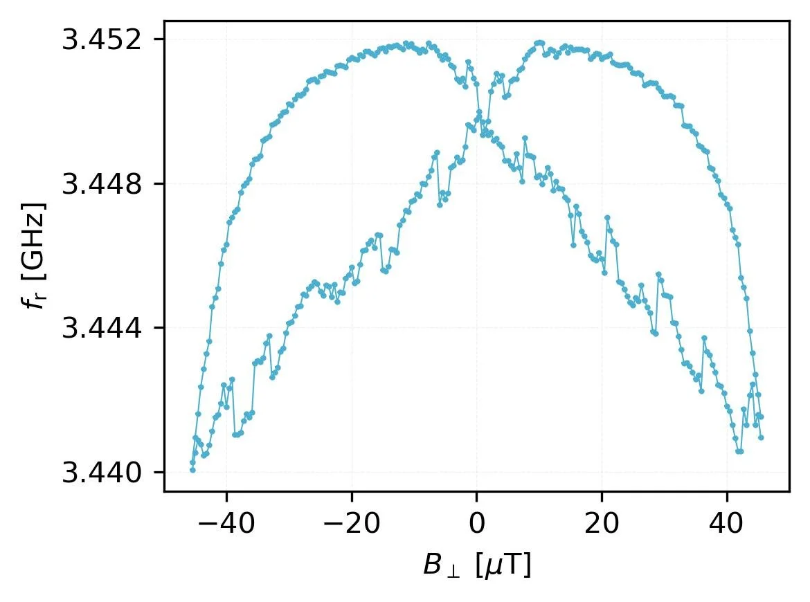 That’s what happens when you pray too hard for your data to be good! Hysteresis loop of the resonance frequency of a superconducting coplanar waveguide in the presence of an out-of-plane magnetic field.