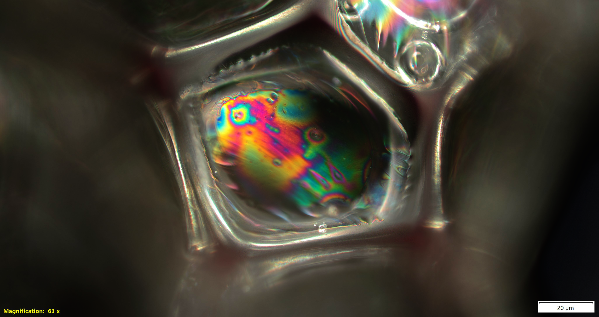 During the fabrication of stamps for 2D device stacking, a polycarbonate film unintentionally dried on a cleanroom cloth. Under the optical microscope, this film reveals a striking pattern of rainbow colors inside the polygonal lattice, — inspiring the title “Quantum Confinement of a Rainbow.