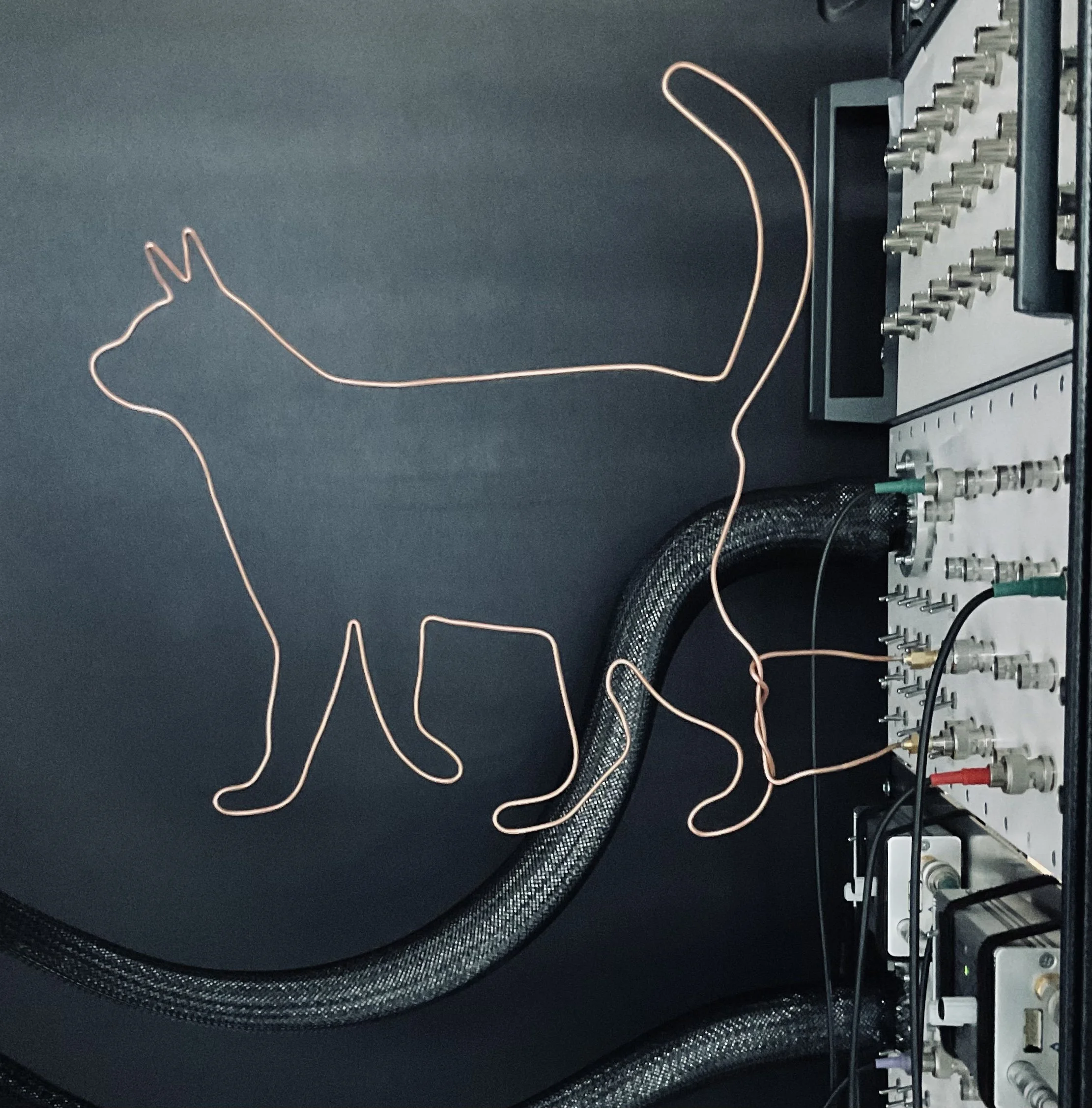 Cat made from cable as a sculpture is coming out of the breakout box.