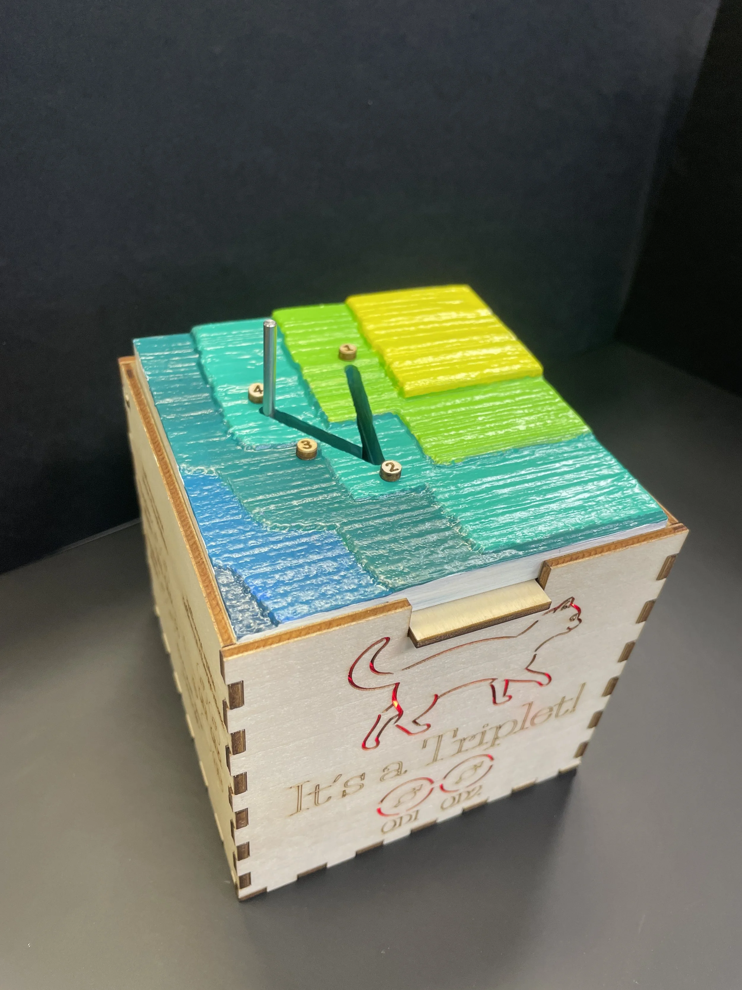 The box has a mechanism, where 50% of the times one side where triplet is written lights up, while the other 50% the other side with singlet written enlightens, when the pin is pushed to the readout point (4). It explains the Pauli spin blockade readout.